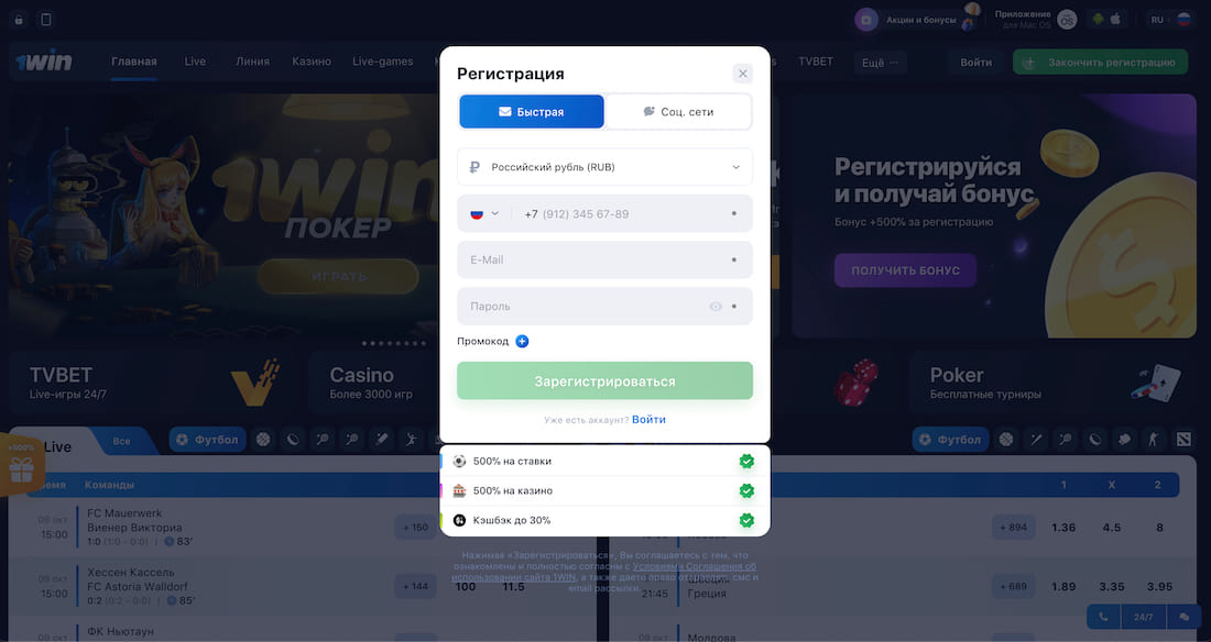 При регистрации можно ввести промокод и воспользоваться дополнительными бонусами. БК не исключение – она периодически дает и новым и действующим пользователям промокод на ставку. Если он у вас имеется, то вводите в соответствующее поле при регистрации на официальном сайте 1вин и убедитесь, что вам зачислены дополнительные средства на бонусный счет.